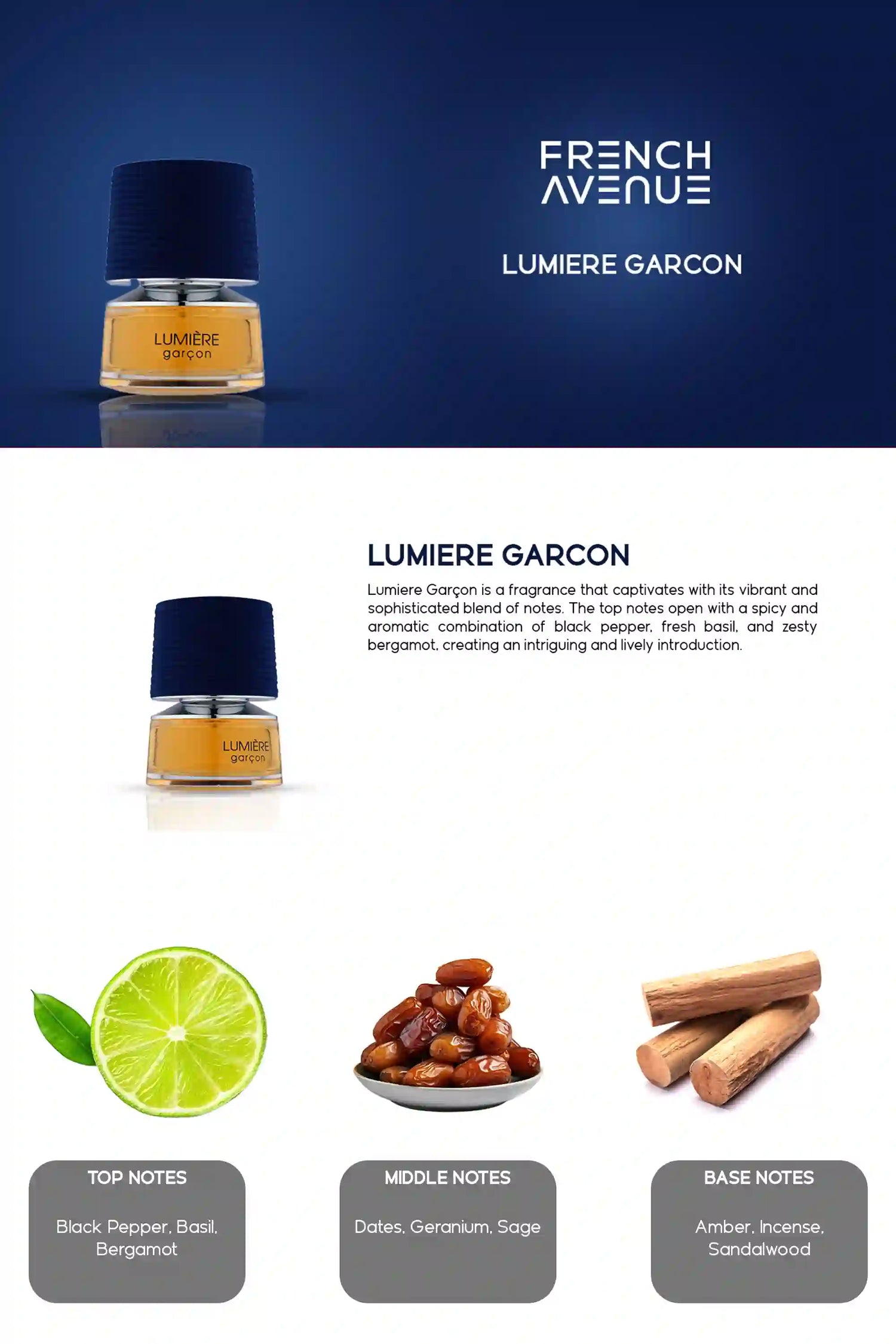 Envelop your senses in Lumiere Garcon, an exquisite amber - woody fragrance highlighted by captivating notes of basil, dates, amber. This strong intensity scent invites you into a personal moment of sophistication and elegance, evoking a sensory experience uniquely yours.