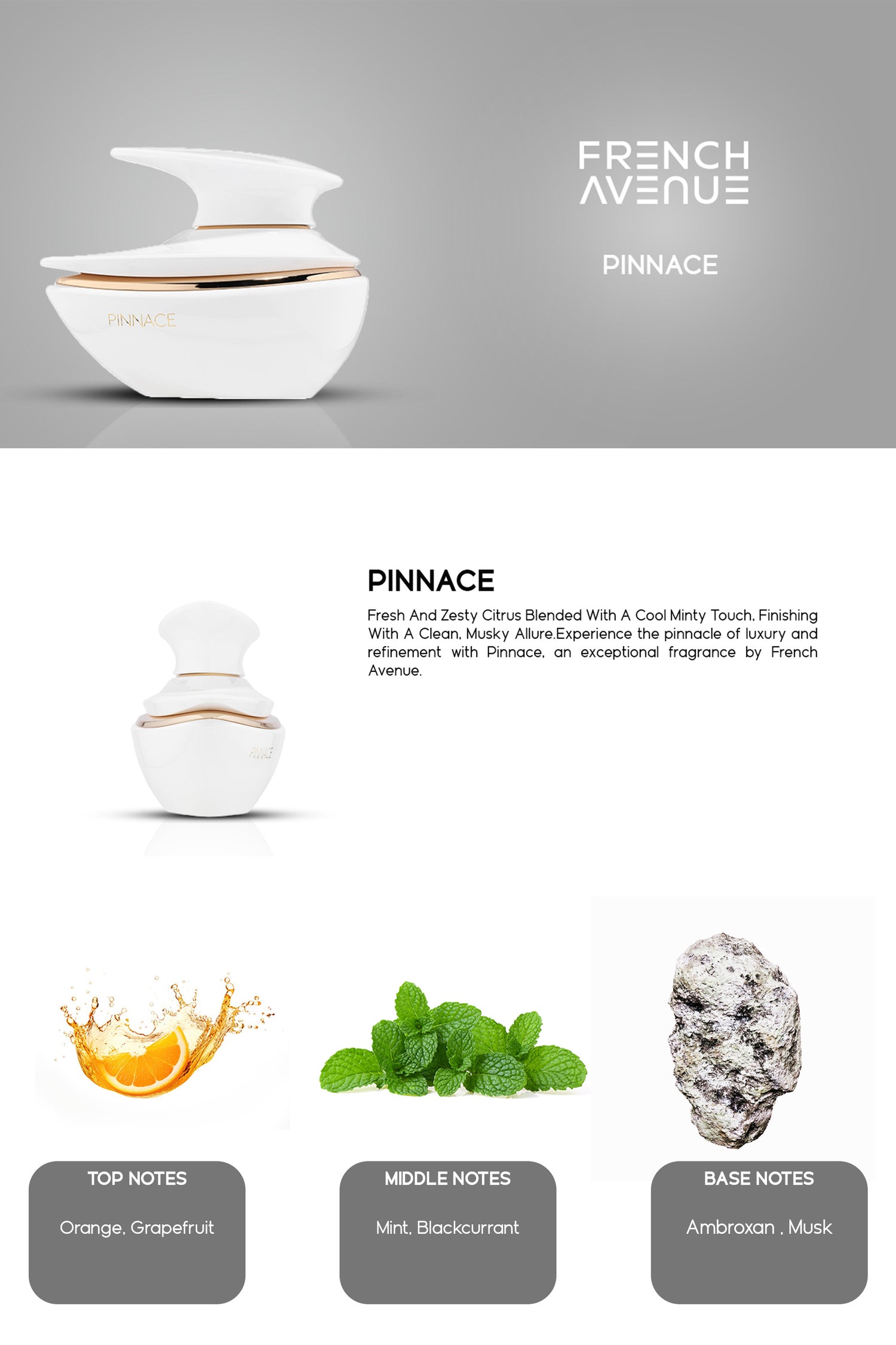 Envelop your senses in Pinnace, an exquisite aromatic - musky fragrance highlighted by captivating notes of orange, grapefruit, ambroxan. This mild intensity scent invites you into a personal moment of sophistication and elegance, evoking a sensory experience uniquely yours.