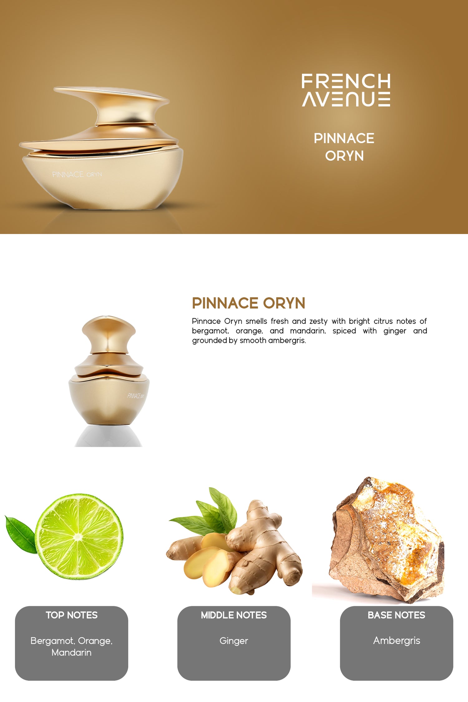 Envelop your senses in Pinnace Oryn, an exquisite citrus fragrance highlighted by captivating notes of bergamot, ginger, ambergris. This mild intensity scent invites you into a personal moment of sophistication and elegance, evoking a sensory experience uniquely yours.