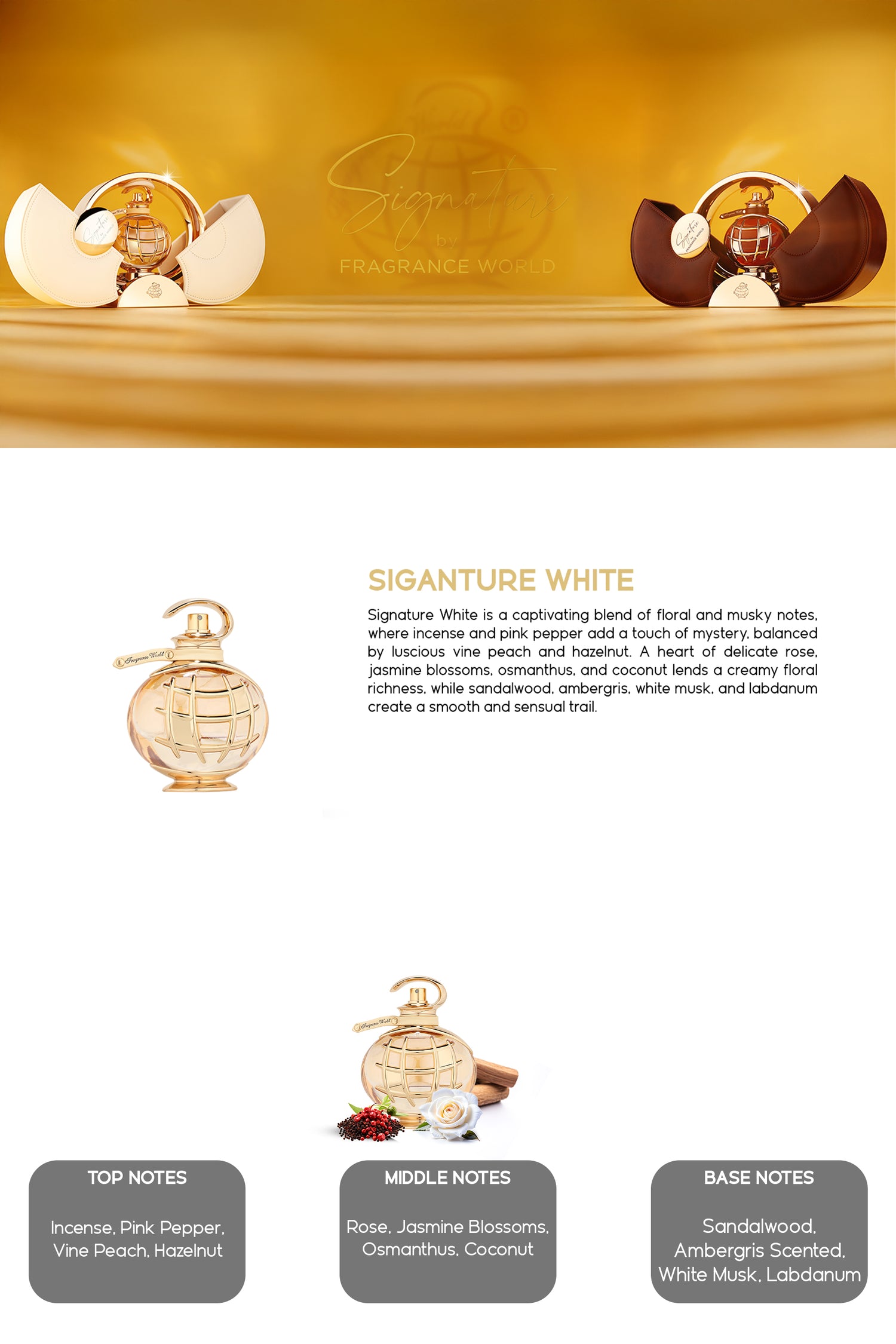 Envelop your senses in Signature White, an exquisite floral - musk fragrance highlighted by captivating notes of vine peach, coconut, white musk. This mild intensity scent invites you into a personal moment of sophistication and elegance, evoking a sensory experience uniquely yours.